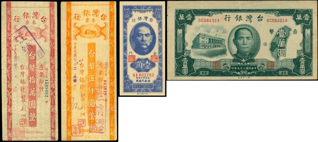 Bank of Taiwan, a group of 4 banknotes and circulating cashier's cheques, 10 cents, Kinmen, 1950, 10,000 yuan, 1944, the cashier's cheques for 5000 yuan and 100,000 yuan, orange and red respectively,