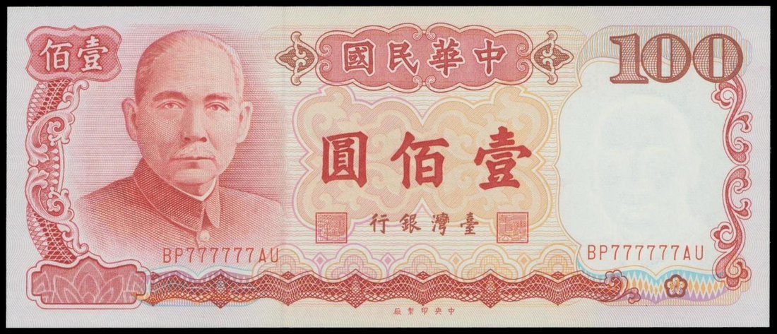 Bank of Taiwan, 100 yuan, 1987, solid serial number BP777777AU, red on multicolour underprint, Sun Yat Sen at left, reverse red, building of Sun Yat Sen Memorial Hall at centre,