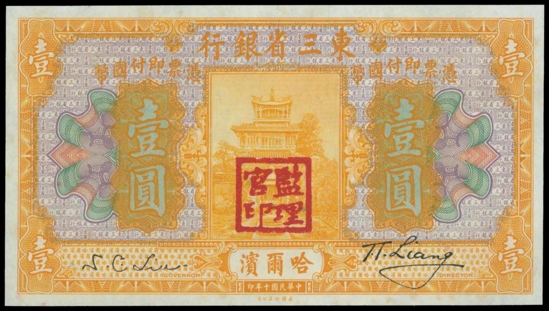 Bank of Manchuria, 1 yuan, 1921, Harbin, serial number E233715, yellow-orange and multicolour, building at centre, red four characters seal overprinted,