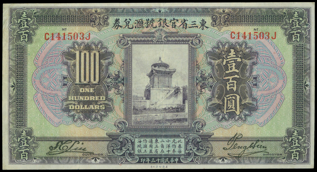 Provincial Bank of the Three Eastern Provinces, $100, 1.1.1924, serial number C141503J, violet and multicolour, stone monument at centre,
