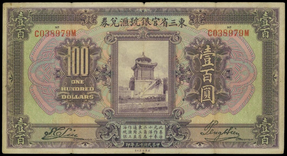 Provincial Bank of the Three Eastern Provinces, $100, 1924, serial number C038979M, violet and multicolour, tower at centre, reverse black,