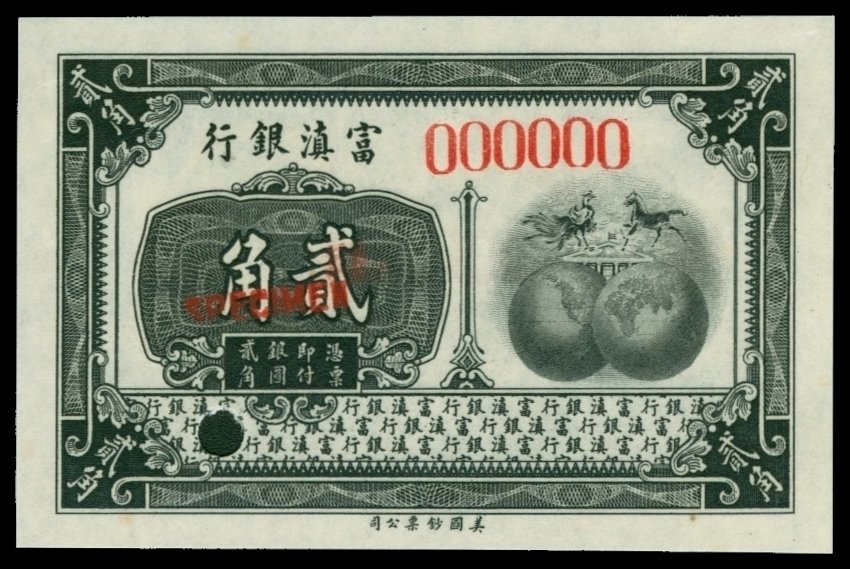 Fu-Tien Bank, 20 cents, ND(1921), specimen, red serial number 000000, black on white, facing pheonix and horse above globe at right, reverse blue on multicolour underprint,