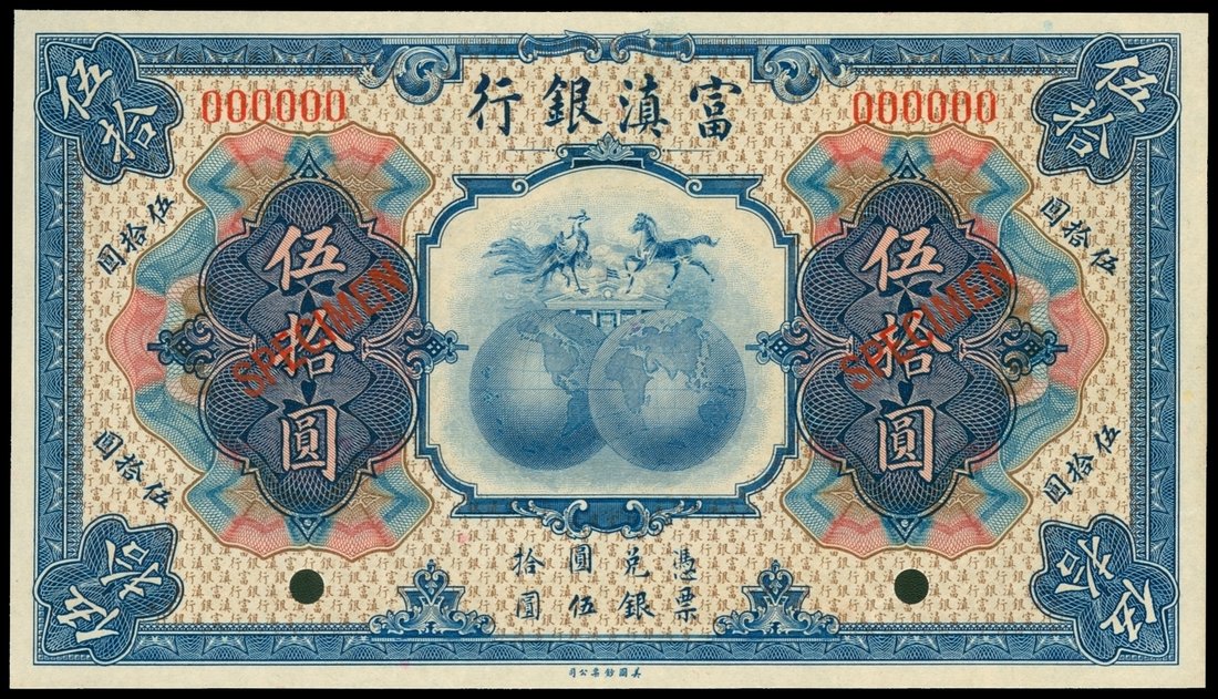 Fu-Tien Bank, $50, 1921, specimen, red serial number 000000, blue on light brown underprint, facing pheonix and horse above globe at centre, reverse brown, tower gateway at centre,