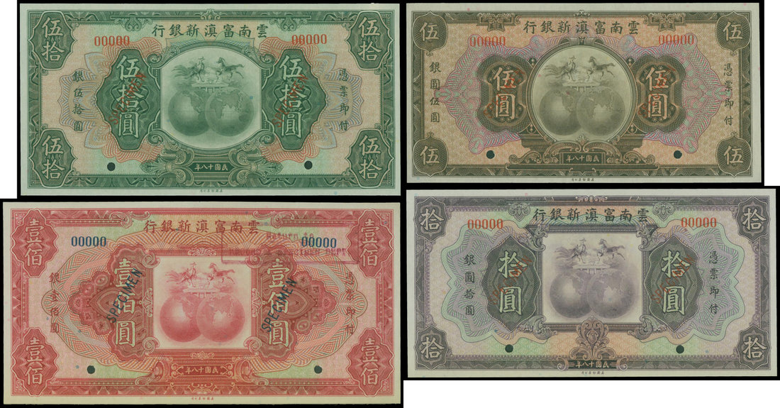 The New Fu Tien Bank, a set of $5, $10, $50 and $100, specimen,1929, brown, purple, green and red on multicolour underprint respectively,