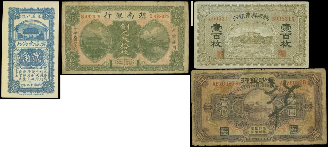 Mixed lot, Changsha Bank 1 yuan, 1928, Hunan Bank 30 copper, 1917, Industrial Development Bank of Jehol 100 coppers, ND(1921), together with a private issue Hsing Cheng Tung 20 cents, 1930, violet, green, olive and blue respectively,