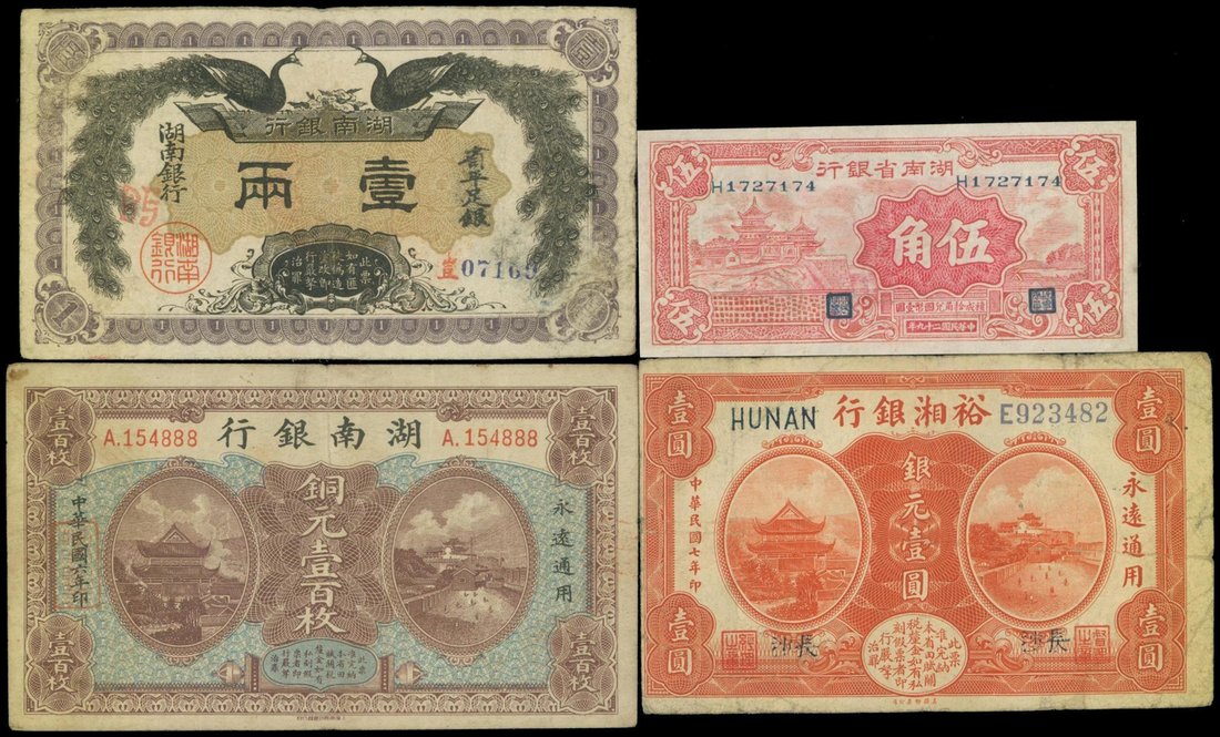 Mixed lot, consisting of the Provincial Bank of Hunan 50 cents, Hunan Bank 100 coppers, Changsha, and 1 tael, together with a Yu Shen Bank $1, Changsha, 1912, 1917, 1918 and 1940,