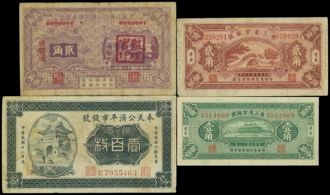 Mixed lot, consisting of Kuang Hsin Syndicate of Heilungkiang 20 cents, Kung Tsi Bank of Fengtien 100 coppers, Provincial Bank of the Eastern Provinces 10 and 20 cents, 1922 and 1929,