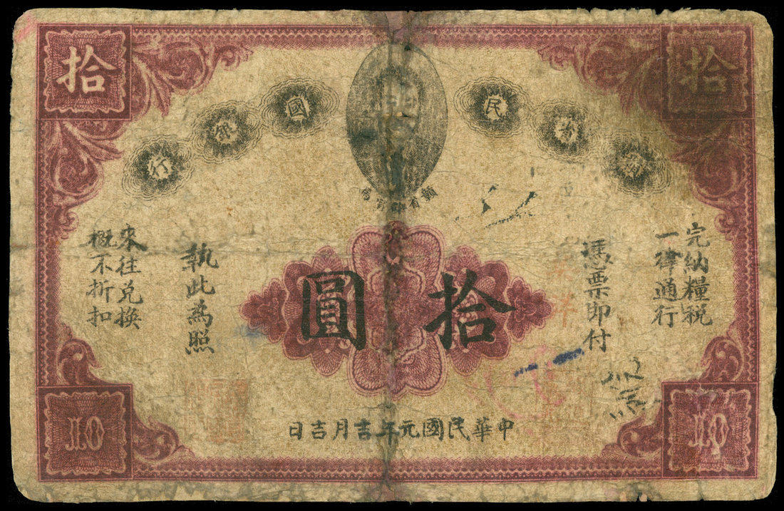 The Kiang-Se Bank of the Republic, Military Note, $10, 1912, purple and black, portrait at top centre, reverse green, text in English,