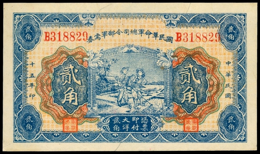Military Note of the National Revolutionary Army, 20 cents, 1926, serial number B318829, blue on multicolour underprint, two farmers at centre, reverse purple, red and black Chinese text,
