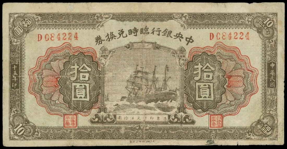 The Central Bank of China, Military Issue, 10 yuan, 1926, serial number D084224, brown and red, ship at centre, reverse blue, large red seal at centre,