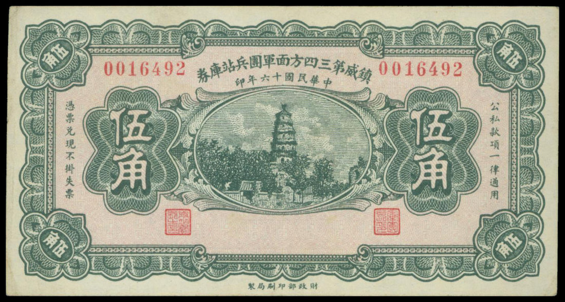Chen Wei, 3rd and 4th Army Corps Treasury Note, 50 cents, 1927, serial number 0016492, olive green on pink underprint, pagoda at centre, reverse grey green,