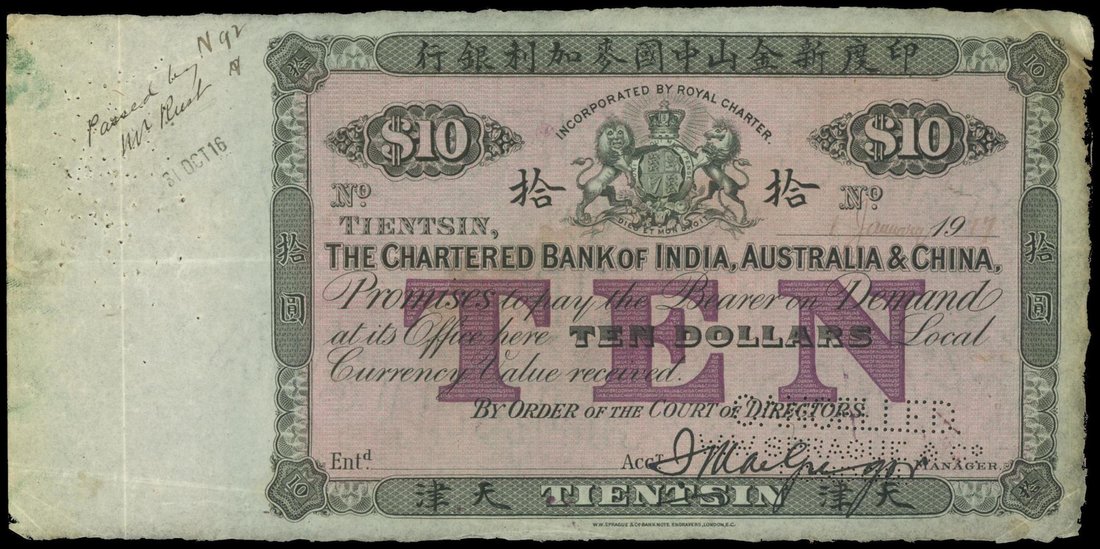 The Chartered Bank of India, Australia and China, $10, Tientsin, specimen/proof, an early date of 1.1.1917, large size note, grey on purple-pink, bank coat of arms at top centre, '$10' to its left and right, manuscript text and signature, perforated 'CANCELLED W.W SPRAGUE & CO, LONDON', over the signature area, reverse green, bank title and denominationin English text,