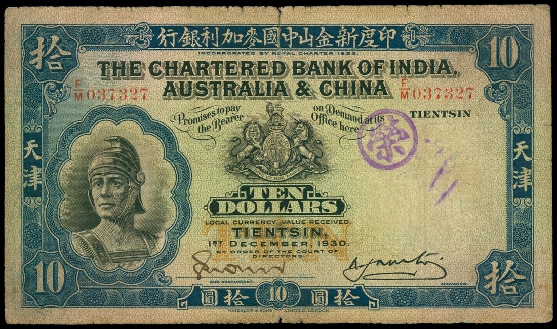 The Chartered Bank of India, Australia and China, $10, Tientsin, 1.12.1930, serial number F/M 037327, blue frame on black and pale green, helmeted Roman solider at right, bank coat of arms upper centre, watermark area at right, handsigned signature, reverse blue, junk baot and sampan,