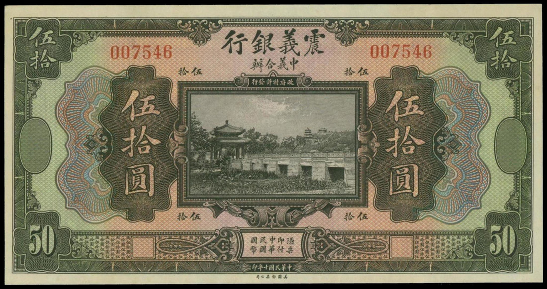 The Chinese Italian Banking Corporation, 50 yuan, 1921, red serial 007546, black and multicoloured, stone bridge and pavilion at centre,