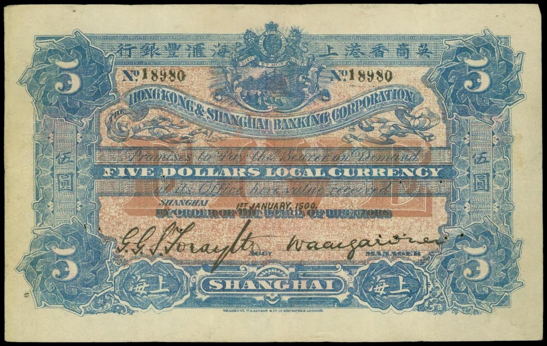Hong Kong and Shanghai Banking Corporation, an old forgery $5, Shanghai, number 18980, printed on a plain newsprint, blue on red underprint, reverse red,