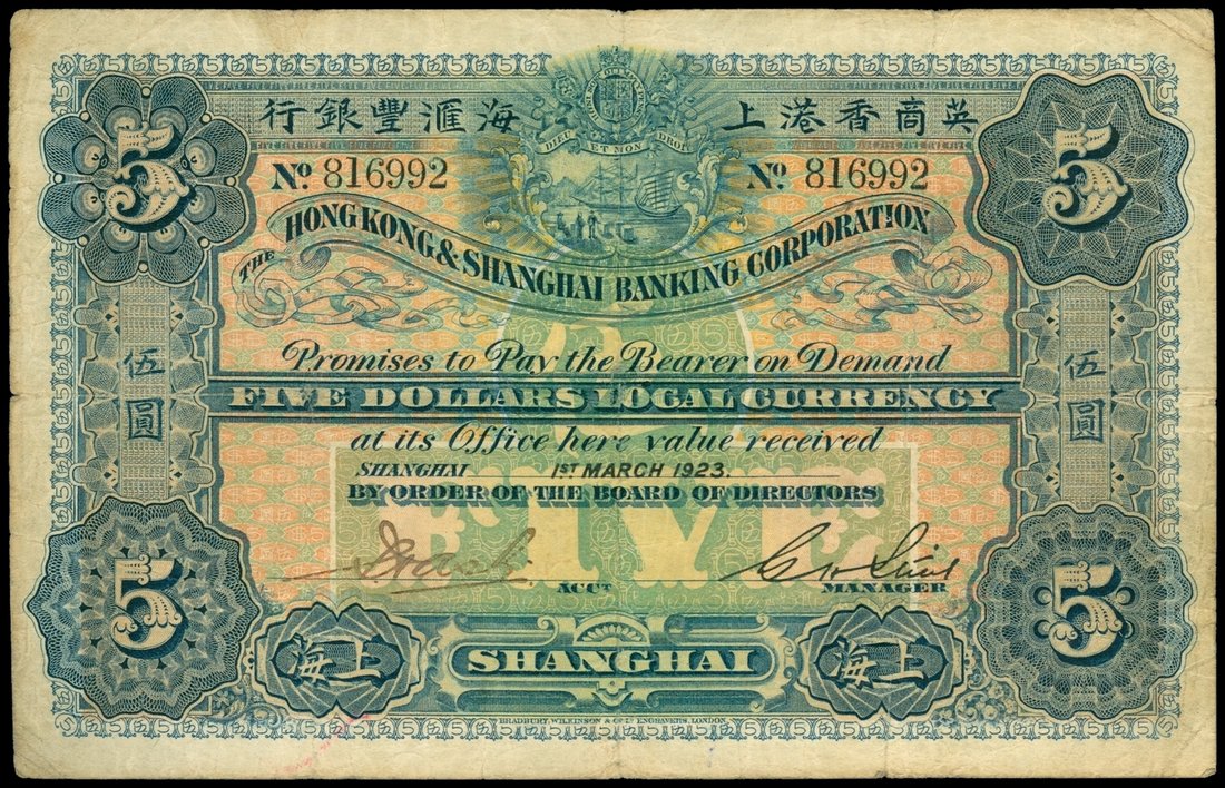 The HongKong and Shanghai Banking Corporation, $5, Shanghai, 1.3.1923, serial number 816992, blue on multicolour, bank coat of arms upper centre, '5' at each corner, handsigned signature, reverse violet and multicolour, allegorical scene of a female figure and cherubs,