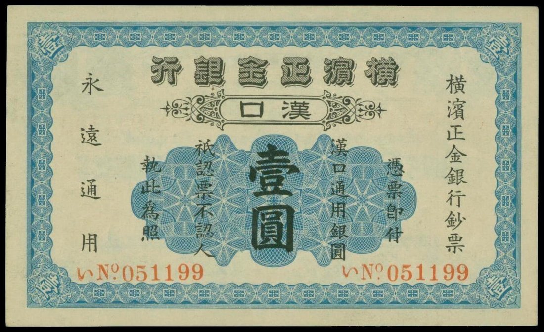 The Yokohama Specie Bank Limited, $1, Hankow, 1917, serial number 051199, blue on yellow, chrysanthemum emblem at top centre, '1' at each corner, manuscript signatures at bottom, reverse black on blue, Chinese text,