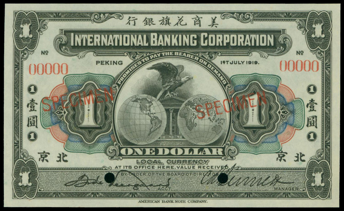 International Banking Corporation, $1, specimen, Peking, 1.7.1919, serial number 00000, black on multicolour, eagle perched upon monument between two globes on obverse, reverse blue,