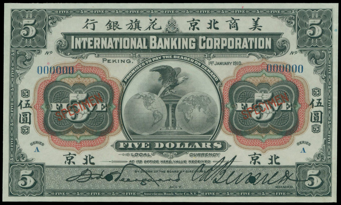 International Banking Corporation, $5, specimen, Peking, 1.1.1910, serial number 000000, black on multicolour, eagle perched upon monument between two globes on obverse, reverse orange,