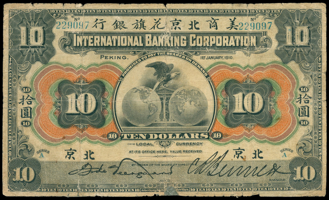 International Banking Corporation, $10, 1910, Peking, serial number 229097, black and multicolour, eagle above globes at centre, reverse black,