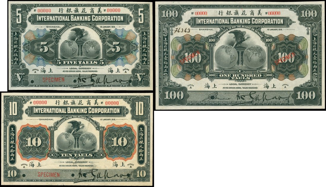 International Banking Corporation, set of 3 'Gui Yuan' specimens for 5, 10 and 100 taels, Shanghai, 1918, serial number 00000, black on multicolour, eagle perched upon stone monument between two globes, printed manuscript signature at bottom right, the reverse different colours, but sinmilar in design to the obverse,