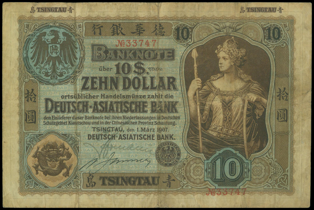Deutsch-Asiatische Bank, $10, Tsingtau, 1.3.1907, serial number 33747, brown on blue underprint, Germania at right, eagle arms top left, two handsigned signatures at lower centre,