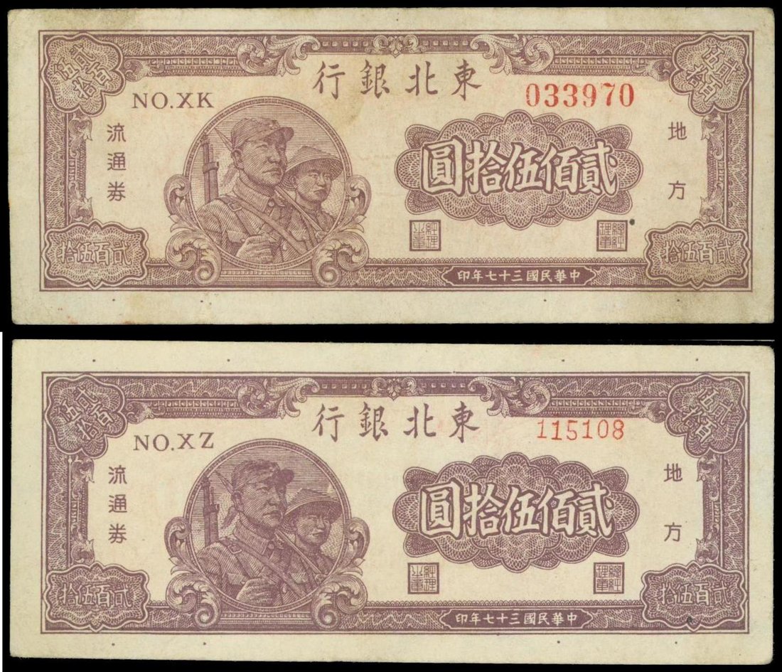 Tung Pei Bank of China, a pair of 250 yuan, 1948, thick and thin serial number 115108, 033970, violet-brown, solider and farmer at left, reverse red, building at centre,