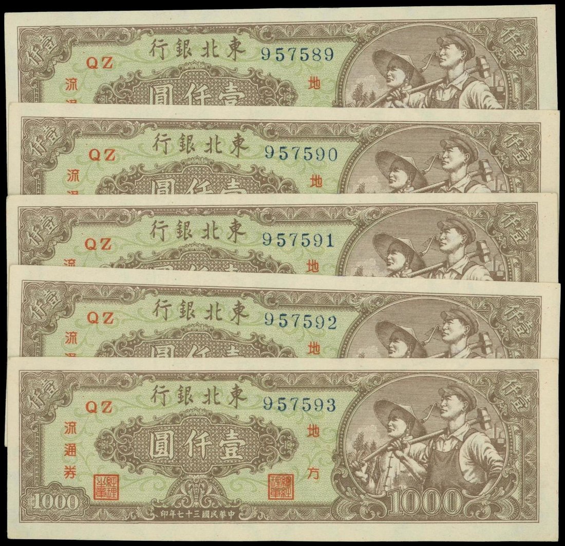 Tung Pei Bank of China, a pair of 1000 yuan, 1948, serial number 385893, 429082, brown on ochre underprint, farmer and worker at right, reverse brown violet, building at centre,