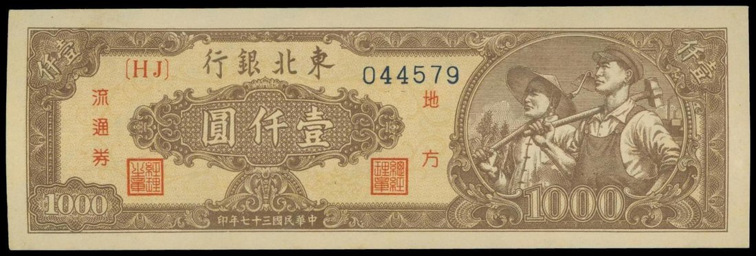 Tung Pei Bank of China, 1000 yuan, 1948, serial number 044579, brown on ochre underprint, farmer and worker at right, reverse brown violet, building at centre,