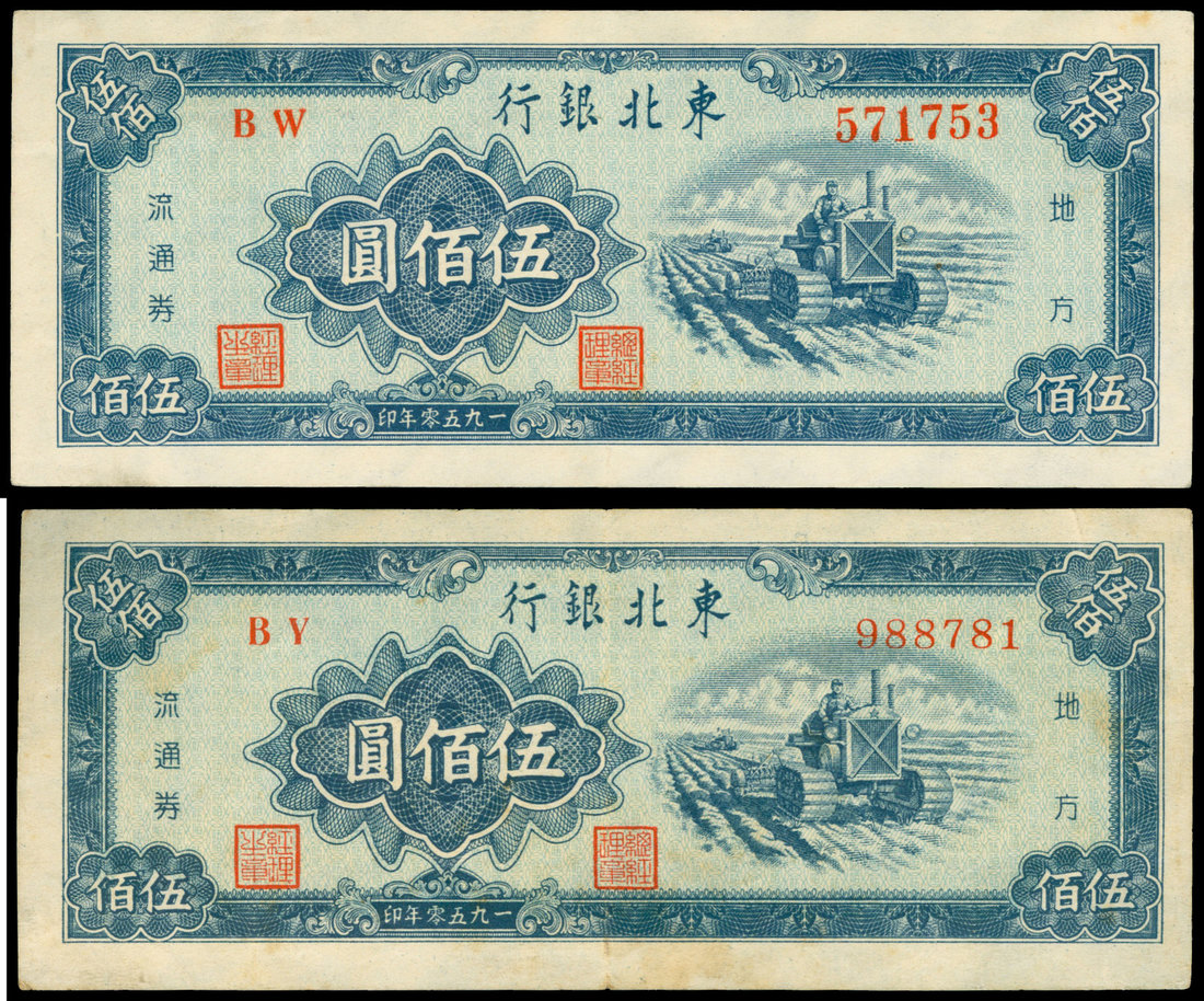 Tung Pei Bank of China, a pair of 500 yuan, 1950, thick and thin serial number 571753 and 988781, dark blue on light blue underprint, cultivating with tractor at right, reverse blue-violet, building at centre,