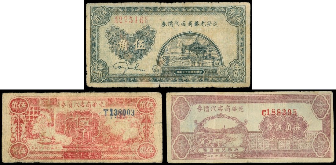 Guangxua Shangdian, group of 3 scarce notes, 5 chiao, 1938, black, 5 chiao and 7 chiao 5 cents red and brown respectively, both dated 1940,
