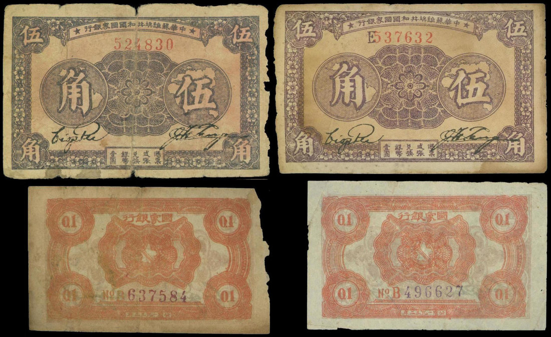 Chinese Soviet Republic National Bank, two pairs of 1 and 5 chiao, 1932 and 1933, serial number B496627, B637584, E537632, 524830, red and violet respectively,