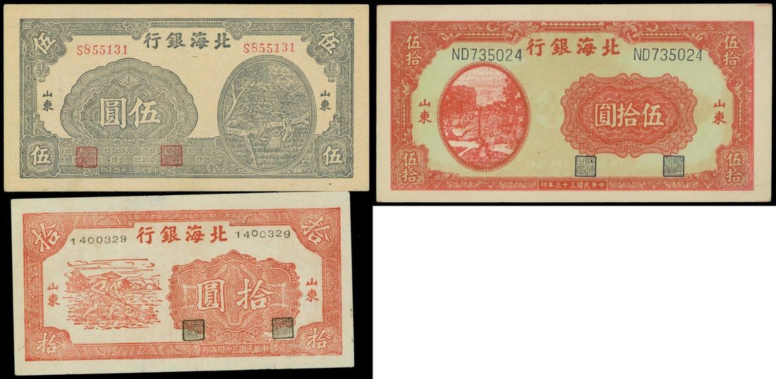 Bank of Bai Hai, group of 3 notes, 5 yuan and 10 yuan 1945, 50 yuan, 1944,