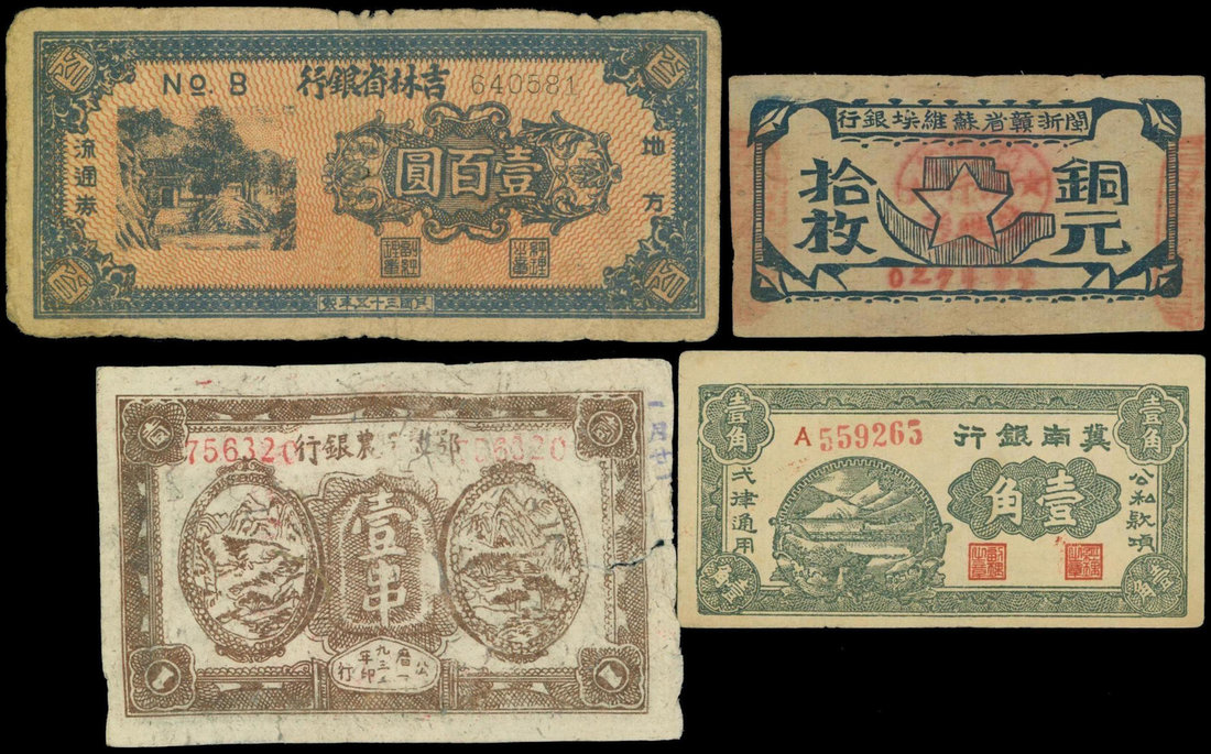 Communist Banks, a group of 4 notes consisting of the following: Fukien-Chekiang, Kiangsi Soviet Bank, 10 coppers, East Hupei Workers and Peasants Bank, 1 chuan, 1932, Bank of Kirin, 100 yuan, 1946 and Bank of Chinan, 1 chiao, 1939,