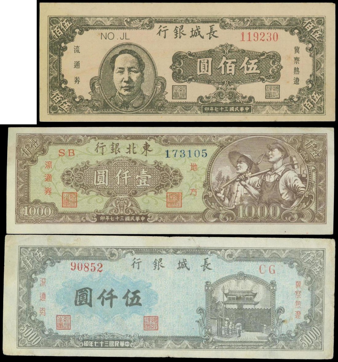 Communist Banks, group of 3 notes consisting of: Bank of Chang Chung, 500 yuan with Mao Zedong, 1948 and 5000 yuan 1948, and Tung Pei Bank, 1000 yuan, 1948,