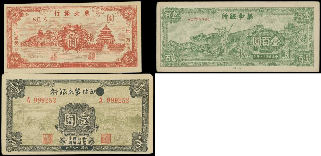 Communist Banks, a group of 3 notes consisting of: Farmers Bank of Northwest, 1 yuan, 1940, Tung Pei Bank, 1 yuan, 1945 and Bank of Central China, 100 yuan, 1945,
