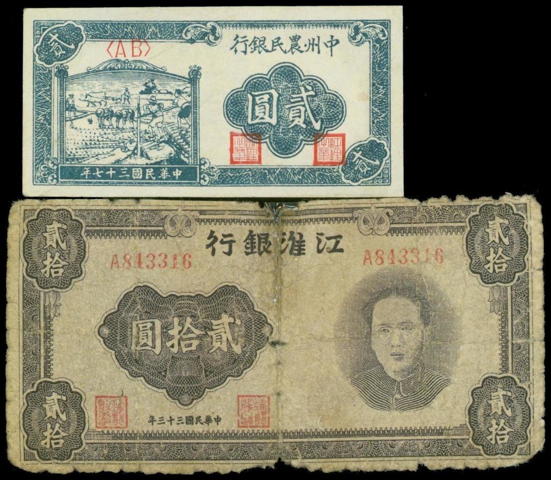 Communist Bank, lot of 2 notes consisting of: Farmers Bank of Chung Chou, 2 yuan, 1948, block serial number and Kiang Hwai Bank of China, 20 yuan, 1944, Moa Zedong at right,