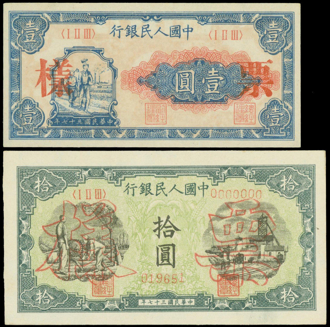 People's Bank of China, 1st series renminbi, 1948-1949, lot of 2 specimens, 1 yuan, 'Factory Worker and Farmer' and 10 yuan 'Well Digging', specimen control numbers 019565 and 019651 respectively,
