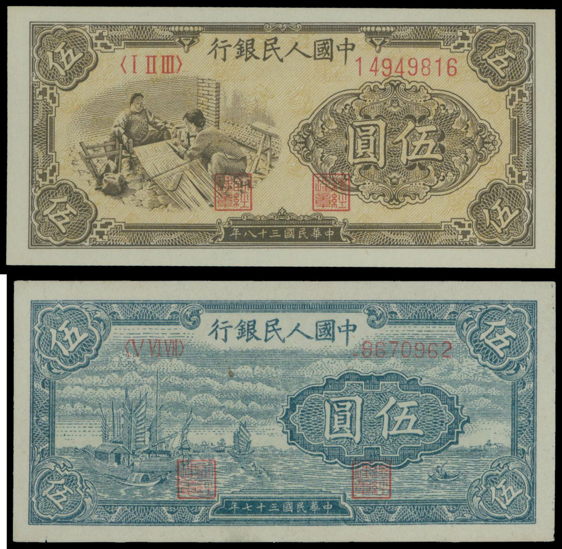 People's Bank of China, 1st series renminbi, 1948-1949, lot of 2 notes, 5 yuan, 'Small Junk' serial number 9670962 and 5 yuan, 'Weaving', serial number <1 II III> 14949816,