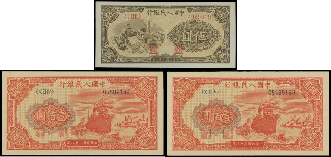 People's Bank of China, 1st series renminbi, 1948-1949, group of 3 notes, 5 yuan 'Weaving' serial number 14949819 and 100 yuan 'Red Ship', consecutive serial numbers 05589184 and 05589185,