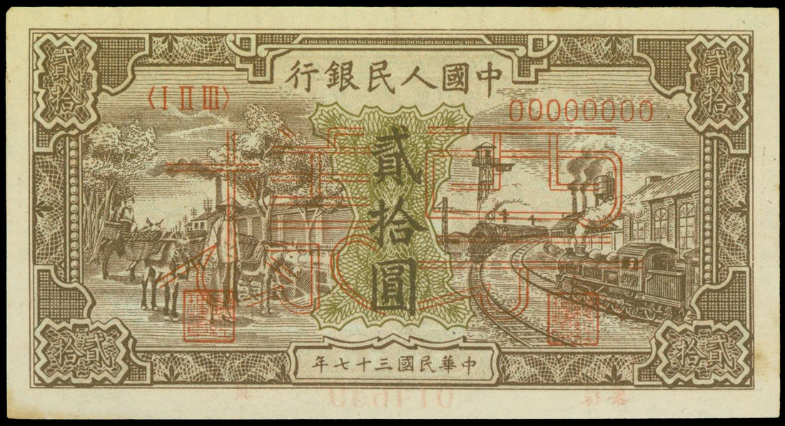 People's Bank of China, 1st series renminbi, 1948-1949, 20 yuan, specimen, 'Donkey and Steam Train', specimen control number 014640,