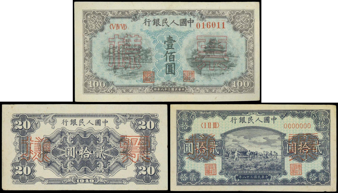 People's Bank of China, 1st series renminbi, 1948-1949, lot of 2 specimens, 20 yuan 'Agricultural Occupations' specimen control number 13556 and 100 yuan 'Blue Bei Hai Bridge', specimen control number 029311,