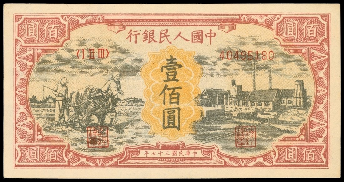 People's Bank of China, 1st series renminbi, a CONTEMPORARY FORGERY of 100 yuan, 1948, 'Ploughing and Factory', serial number I II III 40495180, (Pick 808), about uncirculated or better, sold as is, no returns