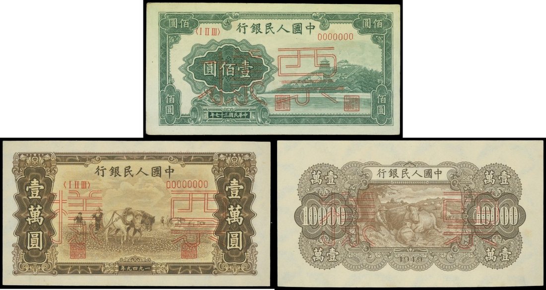 People's Bank of China, 1st series renminbi, 1948-1949, lot of 2 specimens, 100 yuan 'Wan Shou Shan' specimen control number 0019905 and 10,000 yuan 'Two Horses Ploughing', specimen control number 00043212,