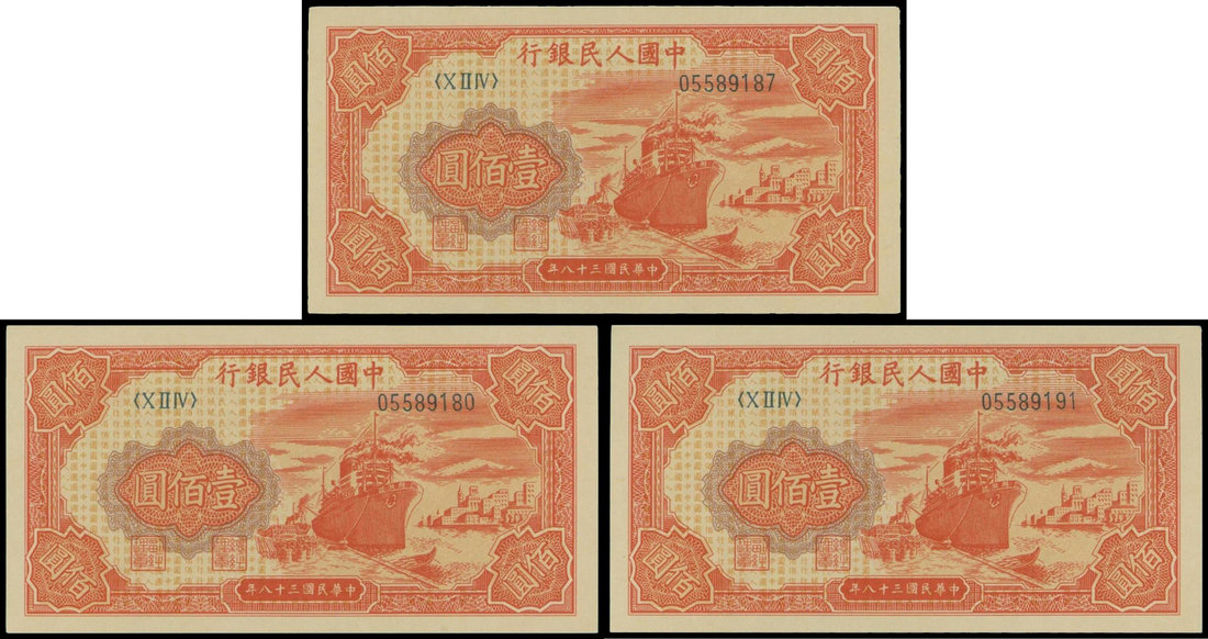 People's Bank of China, 1st series renminbi, 1948-1949, group of 3x 100 yuan, 'Red Ship', serial numbers 05589191, 05589180 and 05589187,
