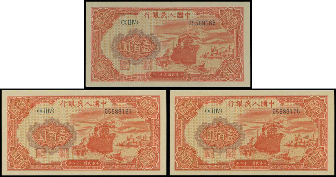 People's Bank of China, 1st series renminbi, 1948-1949, group of 3x 100 yuan, 'Red Ship', serial numbers 05589166, 05589181 and 05589176,