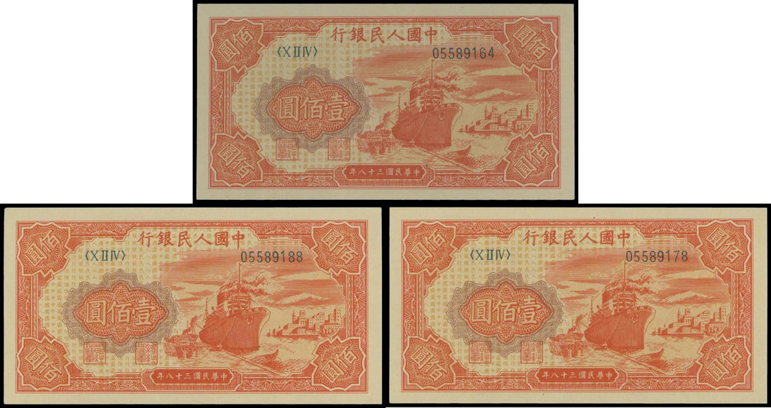 People's Bank of China, 1st series renminbi, 1948-1949, group of 3x 100 yuan, 'Red Ship', serial numbers 05589164, 05589188 and 05589178,