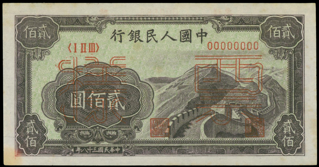People's Bank of China, 1st series renminbi, 1948-1949, 200 yuan, specimen, 'Great Wall', specimen control number 00568,