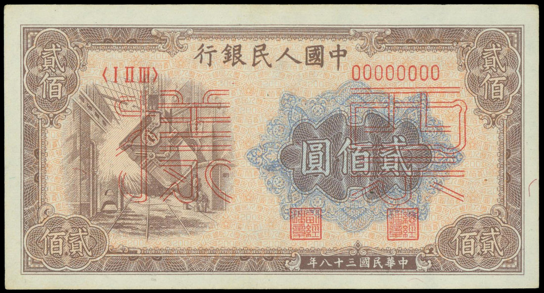 People's Bank of China, 1st series renminbi, 1948-1949, 200 yuan, specimen, 'Steel Making', specimen control number 000133,
