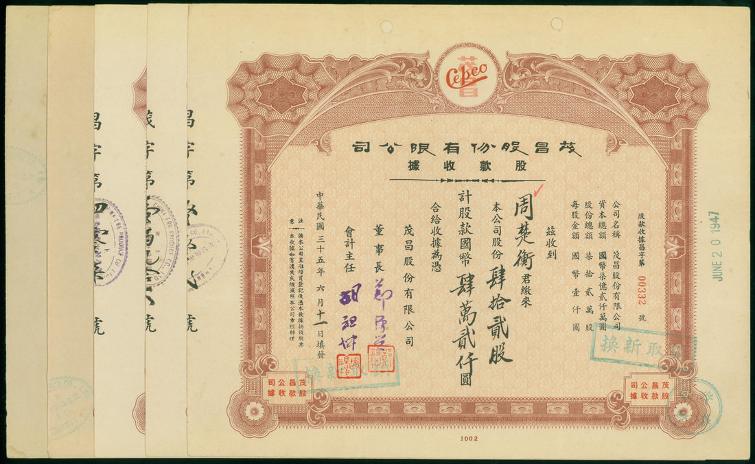 China Egg Produce Co., Ltd., a lot of 5 certificates of shares, 1946-1947, ornate border, English and Chinese company name at top centre, blue stamp at left,